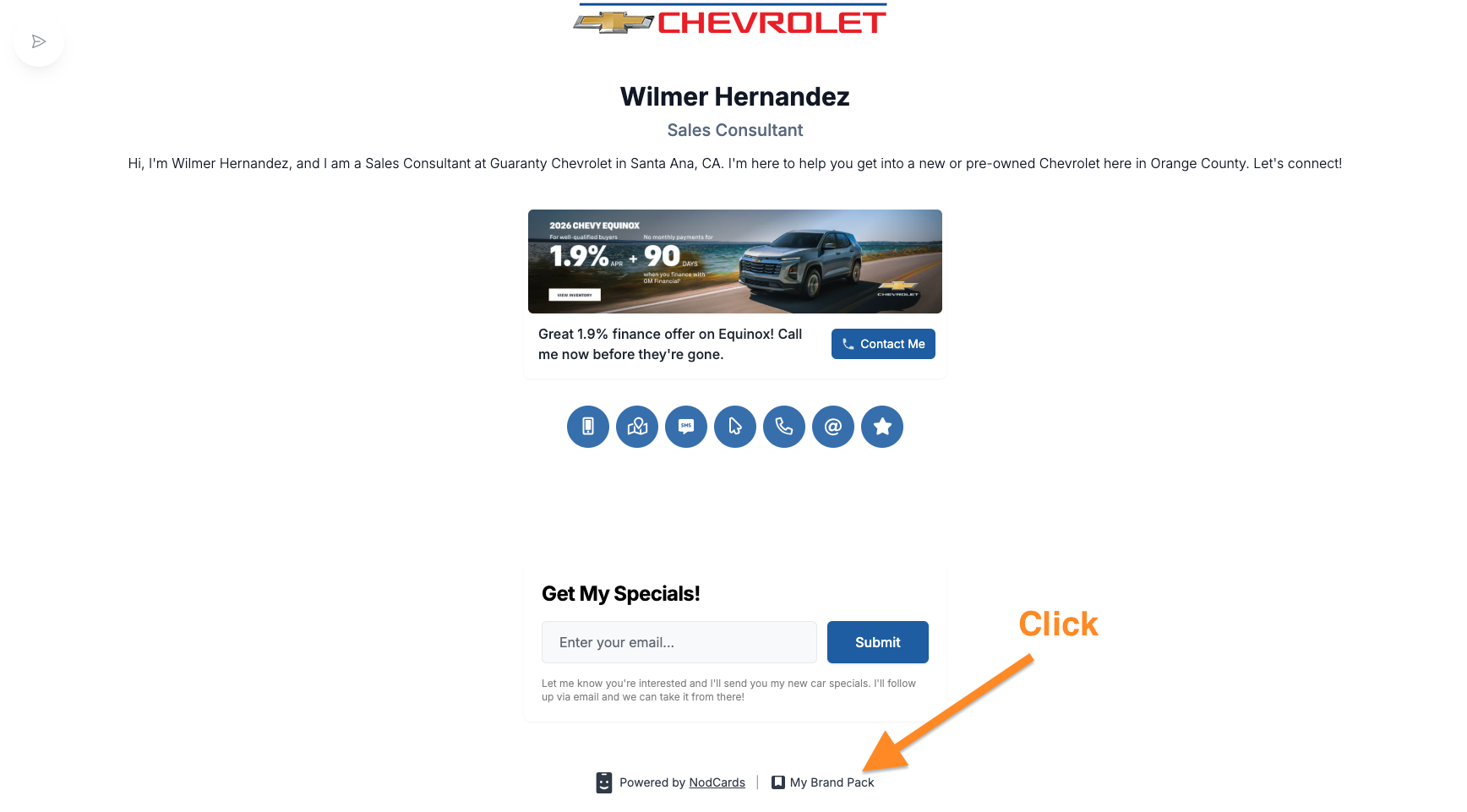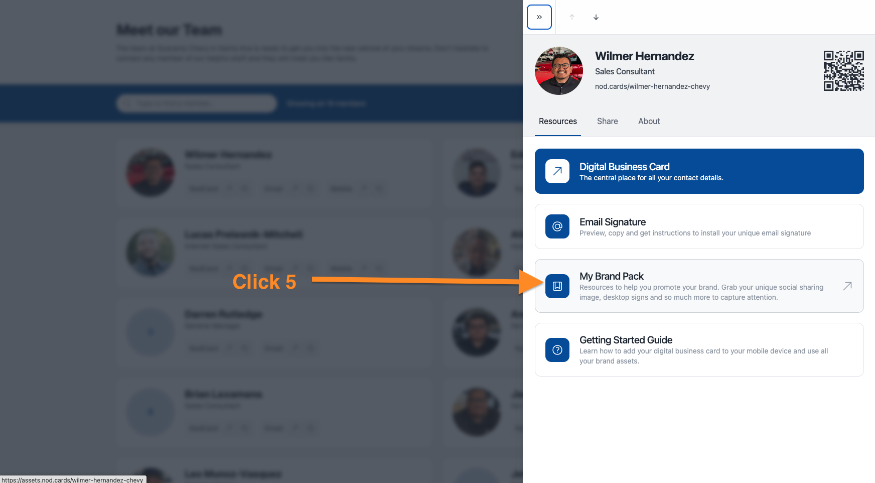 Scroll down to the bottom of any employee's digital business card and click "My Brand Pack".