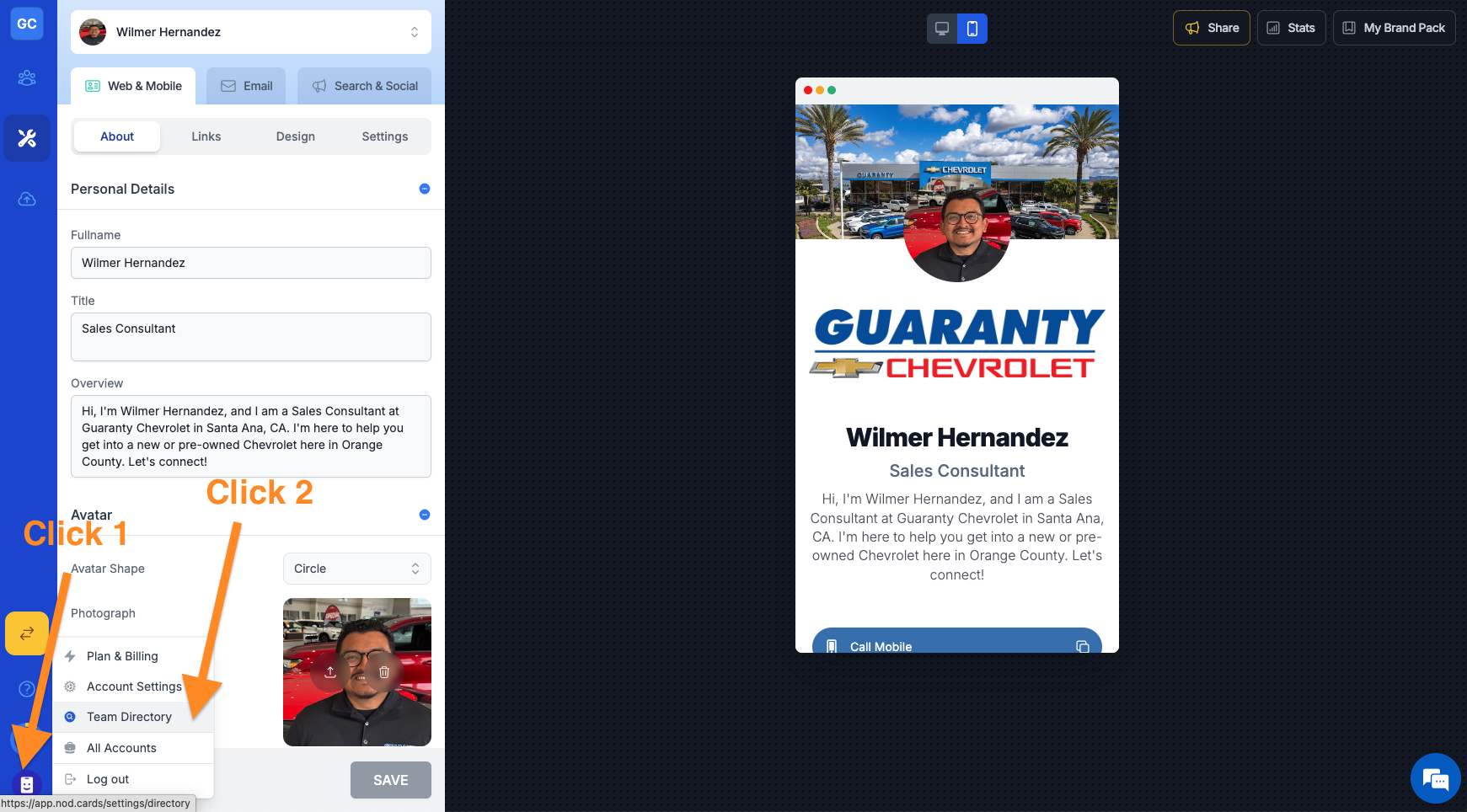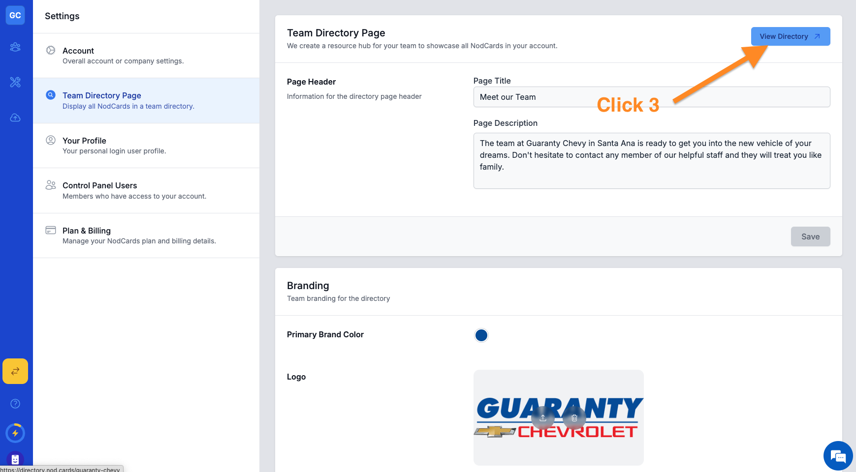 Your Team Directory is where all your employees access their digital branding including: Digital business cards Email signatures QR codes Social media profile backgrounds ...and more Directory Setup From your account: Click the NodCards icon and ...